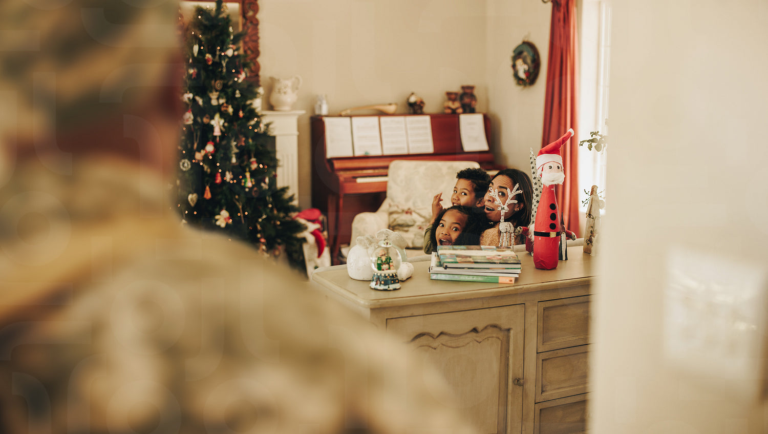 Army soldier making a surprise homecoming. Military man returning to his wife and children from deployment. Serviceman reuniting with his family after serving in the army.