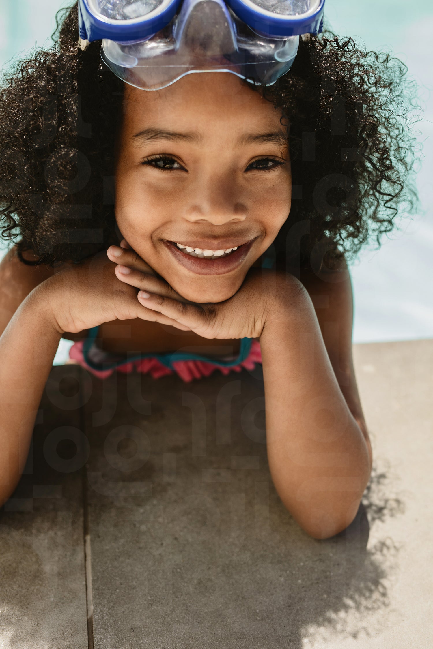 Closeup of cute girl leaning on the edge of a swimming pool wearing swimming goggles on a summer vacation. Girl in a pool looking at camera.