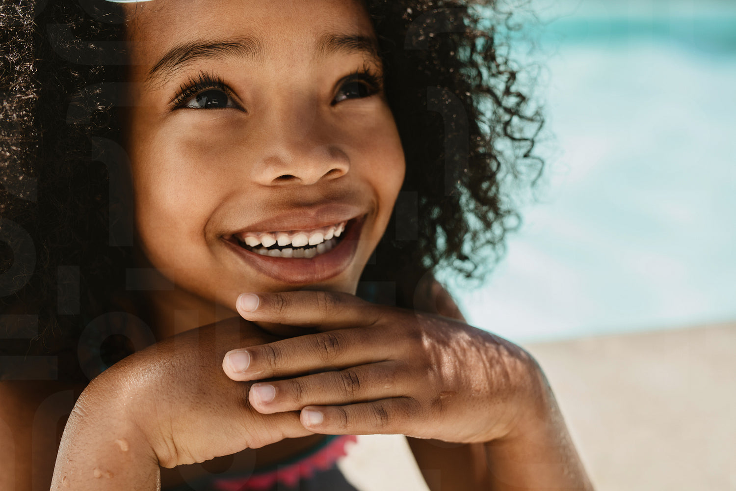 Close-up of a cute girl sitting by a swimming pool and looking away. Girl sitting with her hands on chin and looking away.