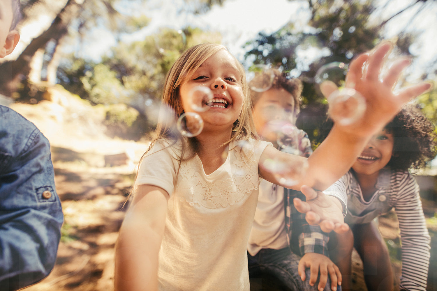 Group of children playing with soap bubbles in forest. Girl with friends catching the soap bubbles.
