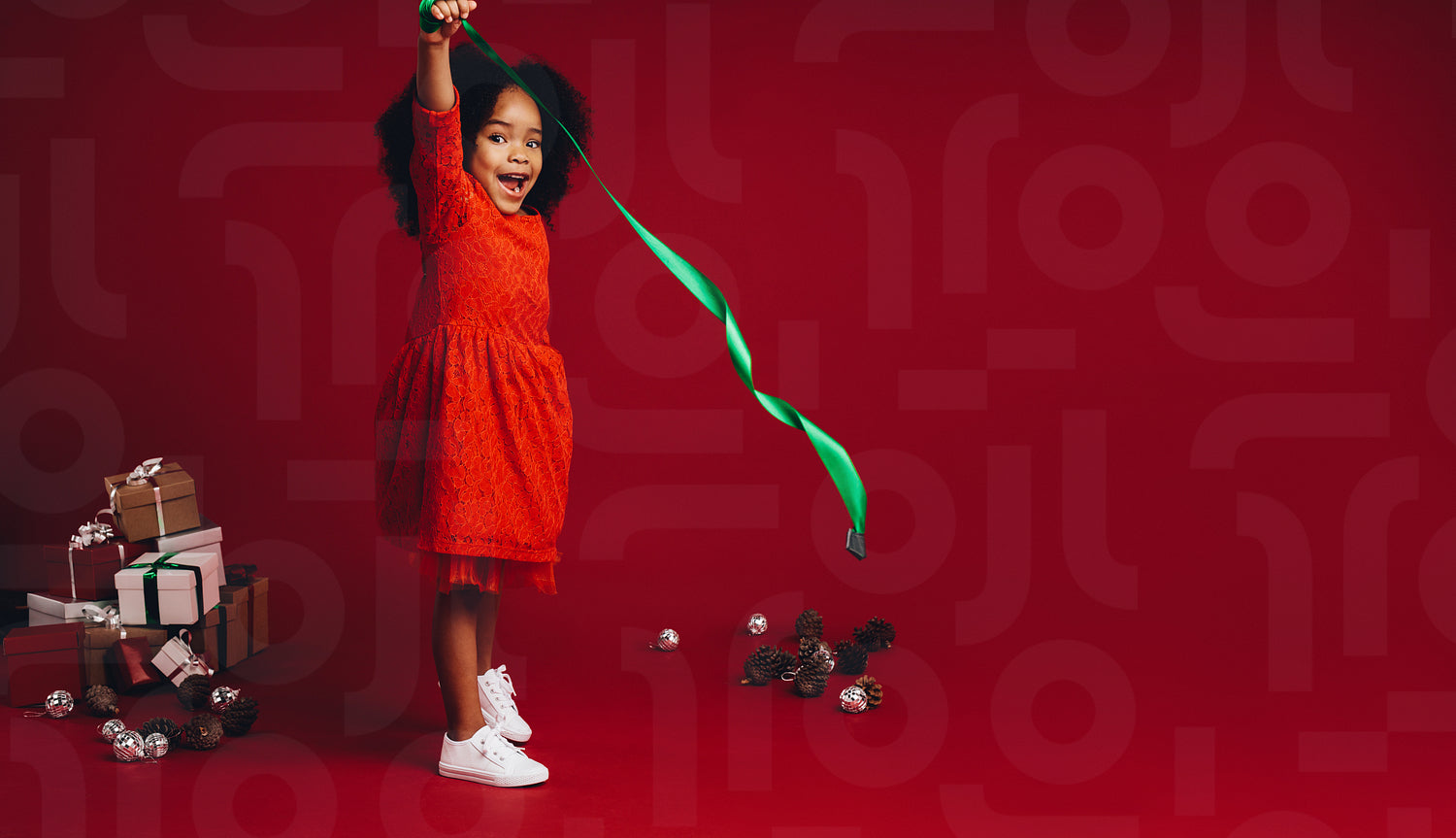 Little girl playing with a ribbon standing beside a pile of gift boxes. Smiling kid having fun playing with decorative items standing against a red background.