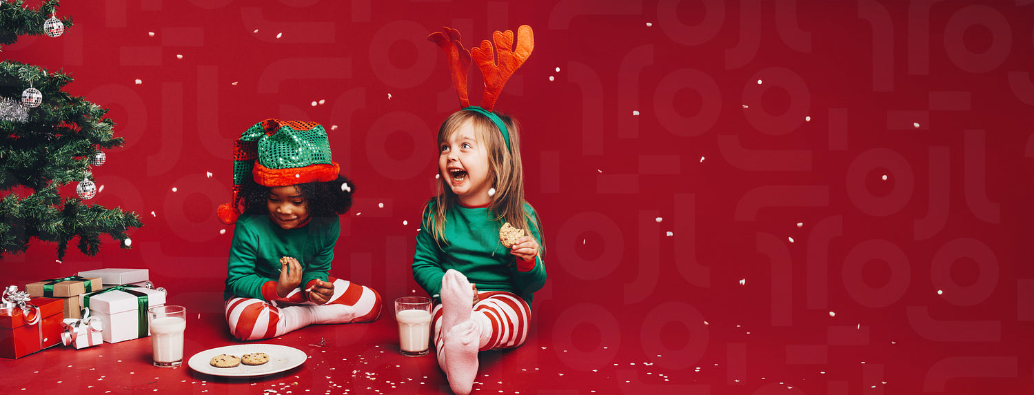 Little girls enjoying the artificial snow flakes falling sitting beside a christmas tree. Kids in fancy christmas clothes sitting beside a christmas tree eating cookies with milk.