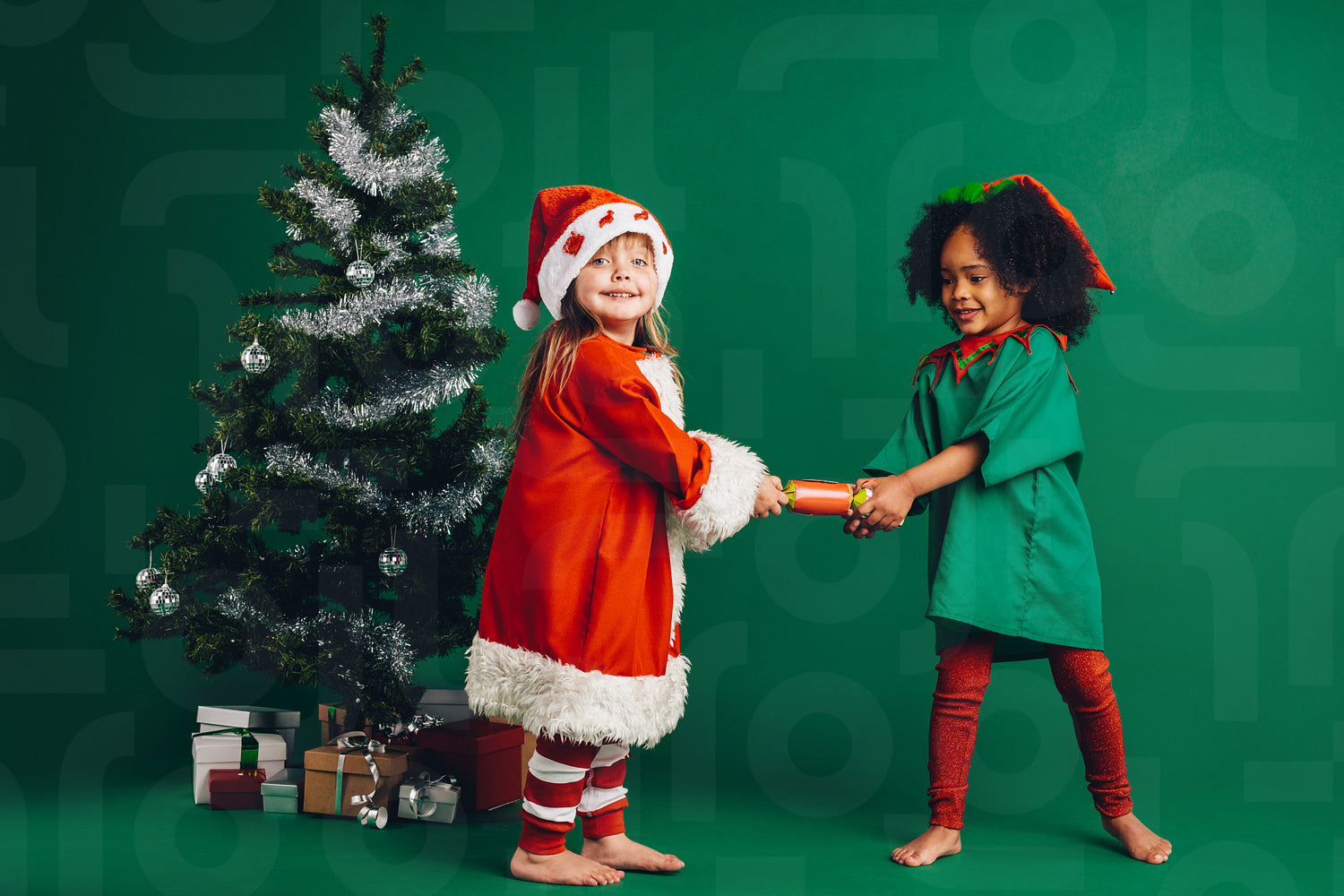 Two little girls in christmas costumes pulling a toy. Kids having fun playing with a toy standing beside a decorated christmas tree.