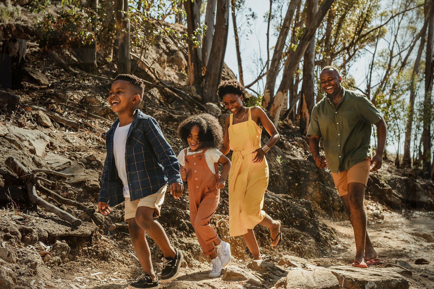 Young family enjoying their holidays in a national park. African family walking down a mountain trail and having fun.