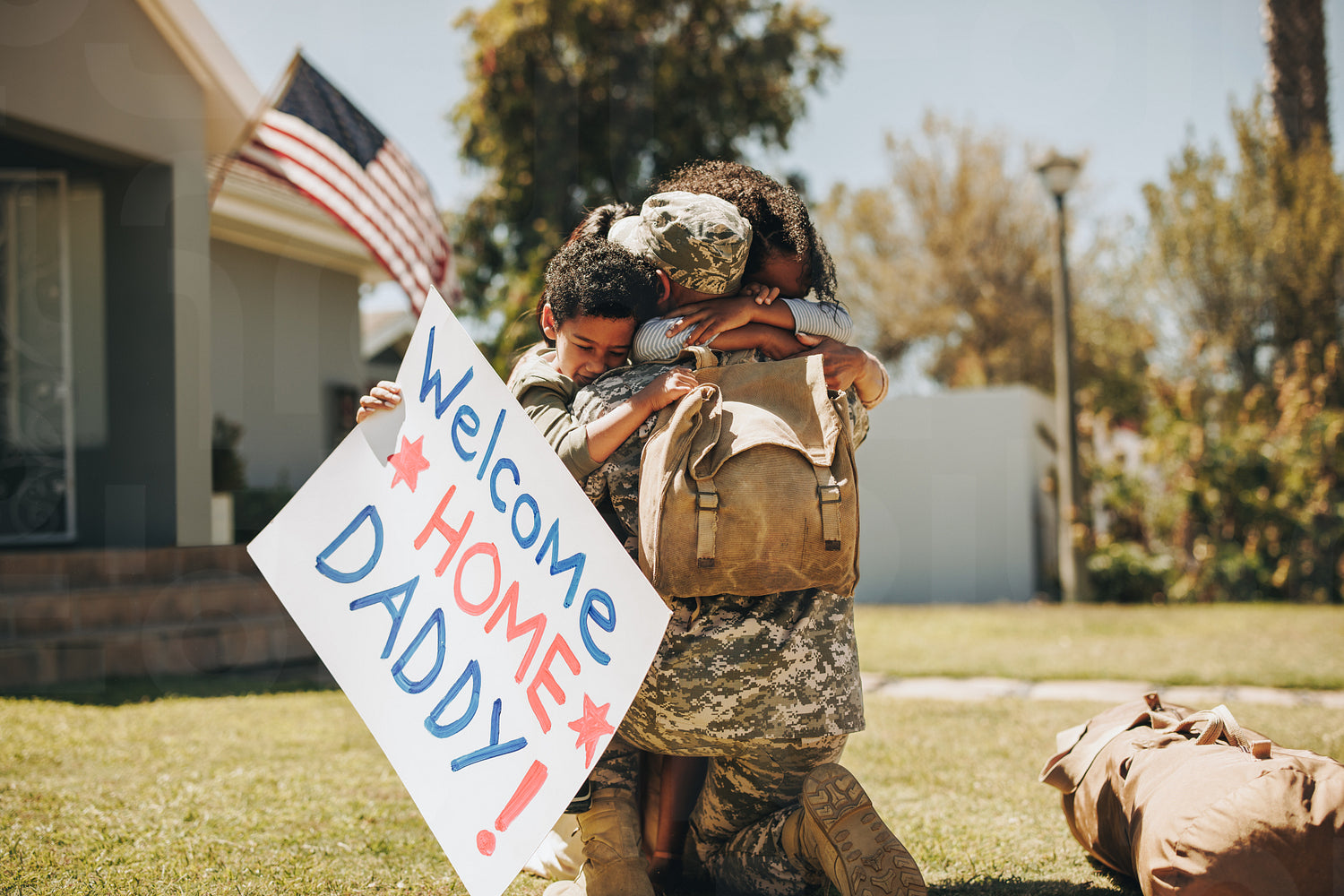 Serviceman reuniting with his family after returning home from the army. American soldier embracing wife and children outdoors. Military man receiving a warm welcome from his family.
