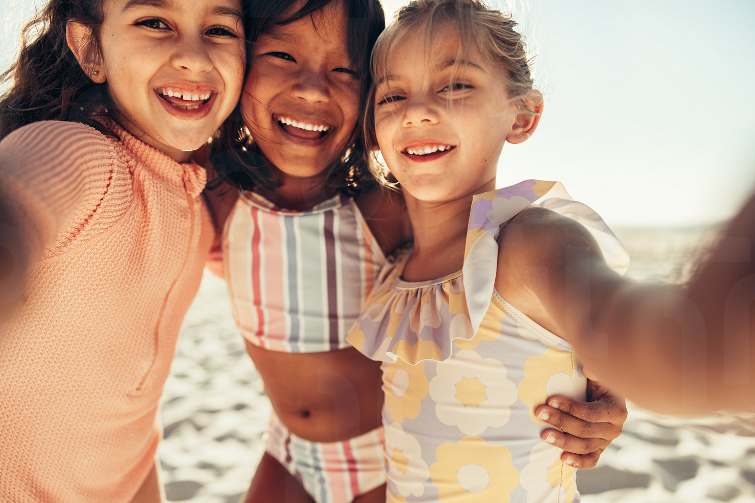 Making happy memories at the beach. Three happy little girls smiling for a group selfie by the seaside. Group of adorable little children having fun together during summer vacation.