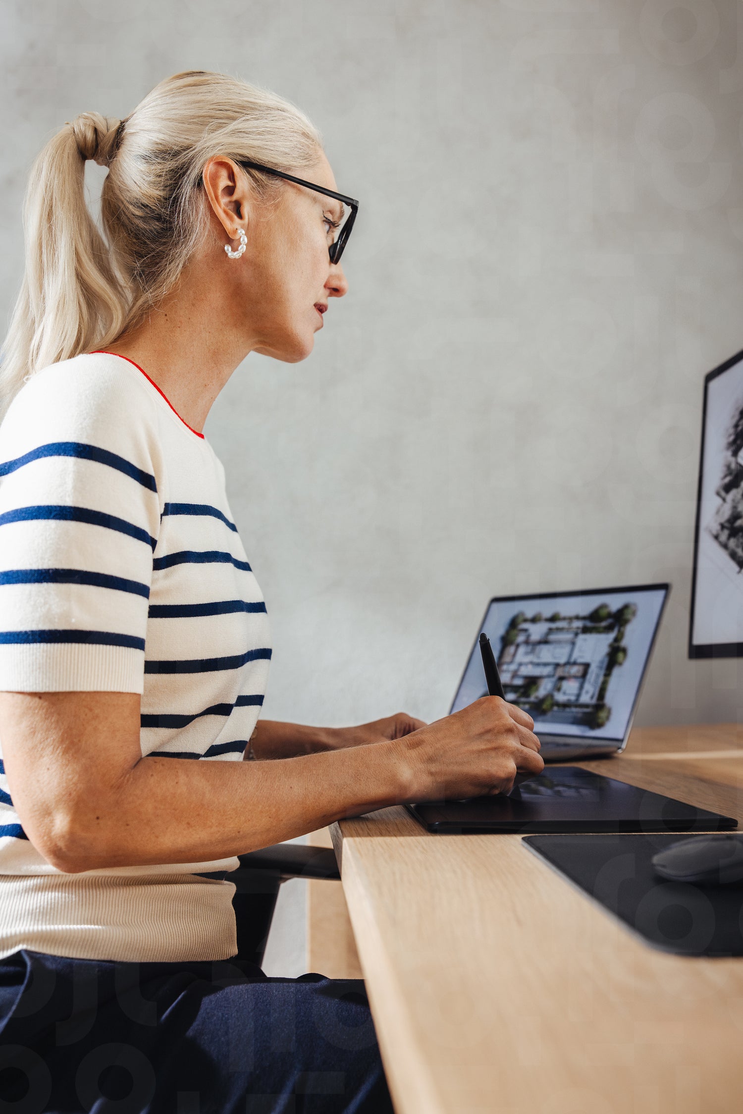 A senior female architect working on a digital design tablet, creating architectural layouts. This highlights creativity and professionalism within an office setting in the modern design industry.