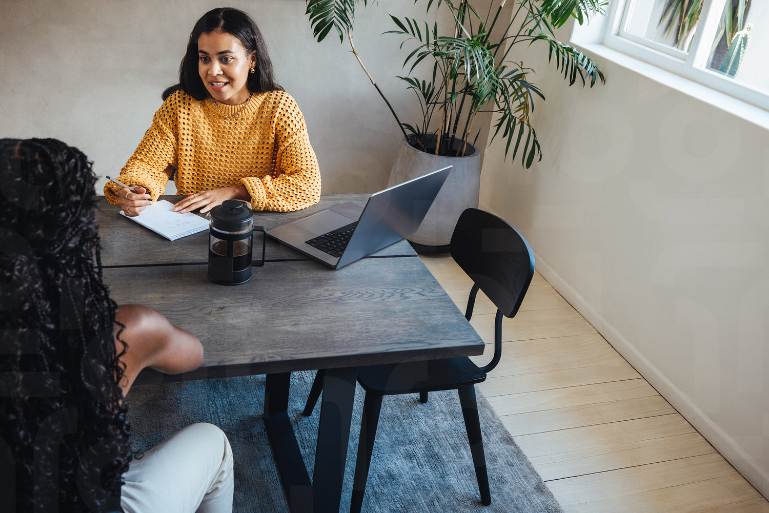 Young female architects discussing ideas during a meeting in a stylish office setting. They are seated at a table with a laptop, coffee maker, and a notebook, fostering collaboration and creativity.
