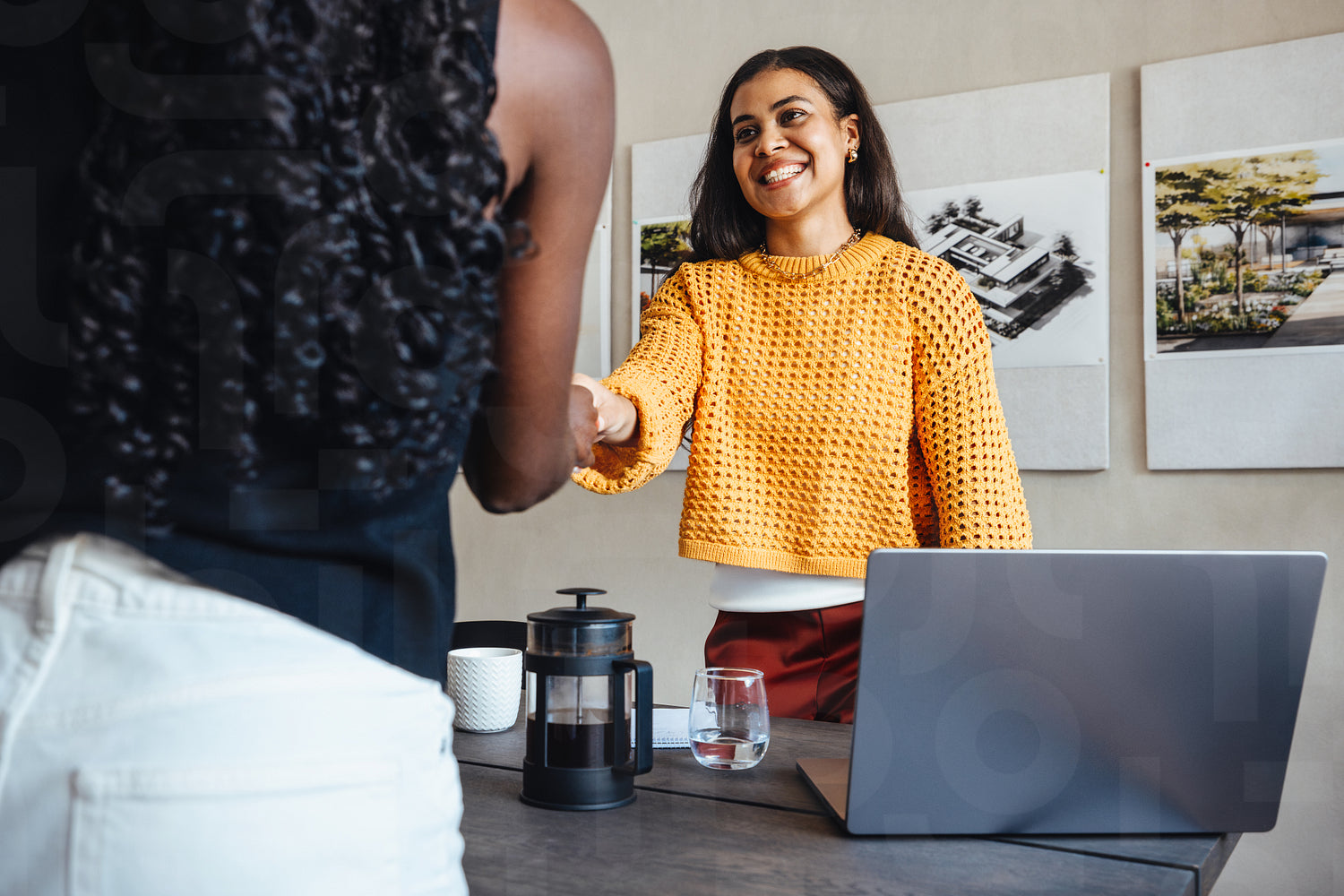 Two women engage in a friendly handshake, showcasing professionalism and collaboration. The workspace has design elements and a relaxed ambiance, aligning with architecture and creative industries.