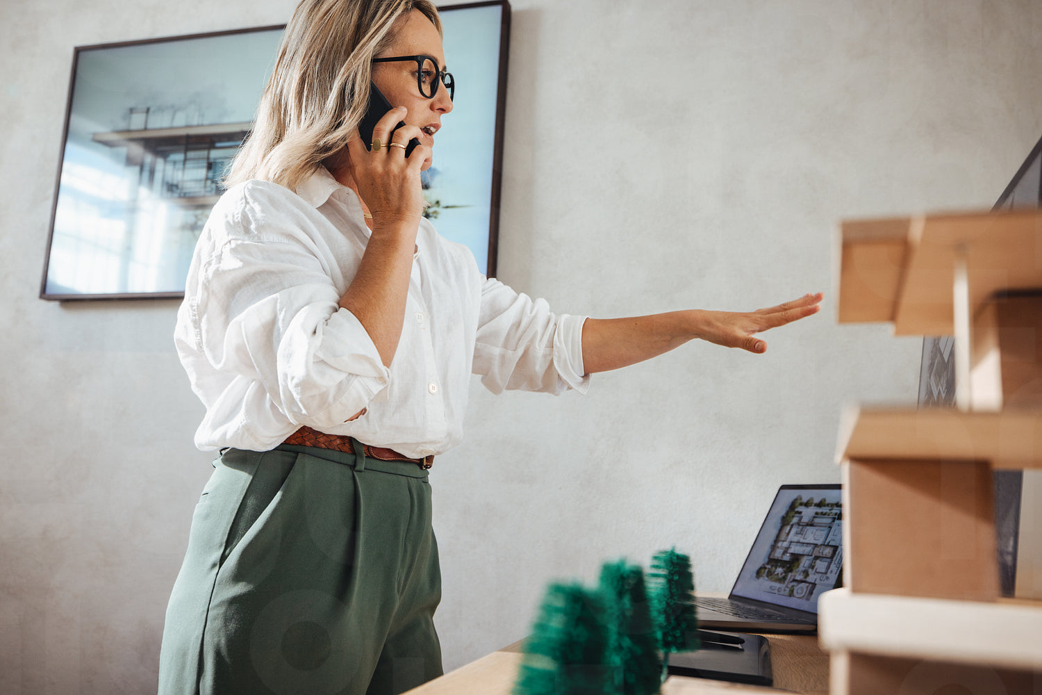 A professional woman analyzes a miniature architectural model while communicating on a phone call in a studio.
