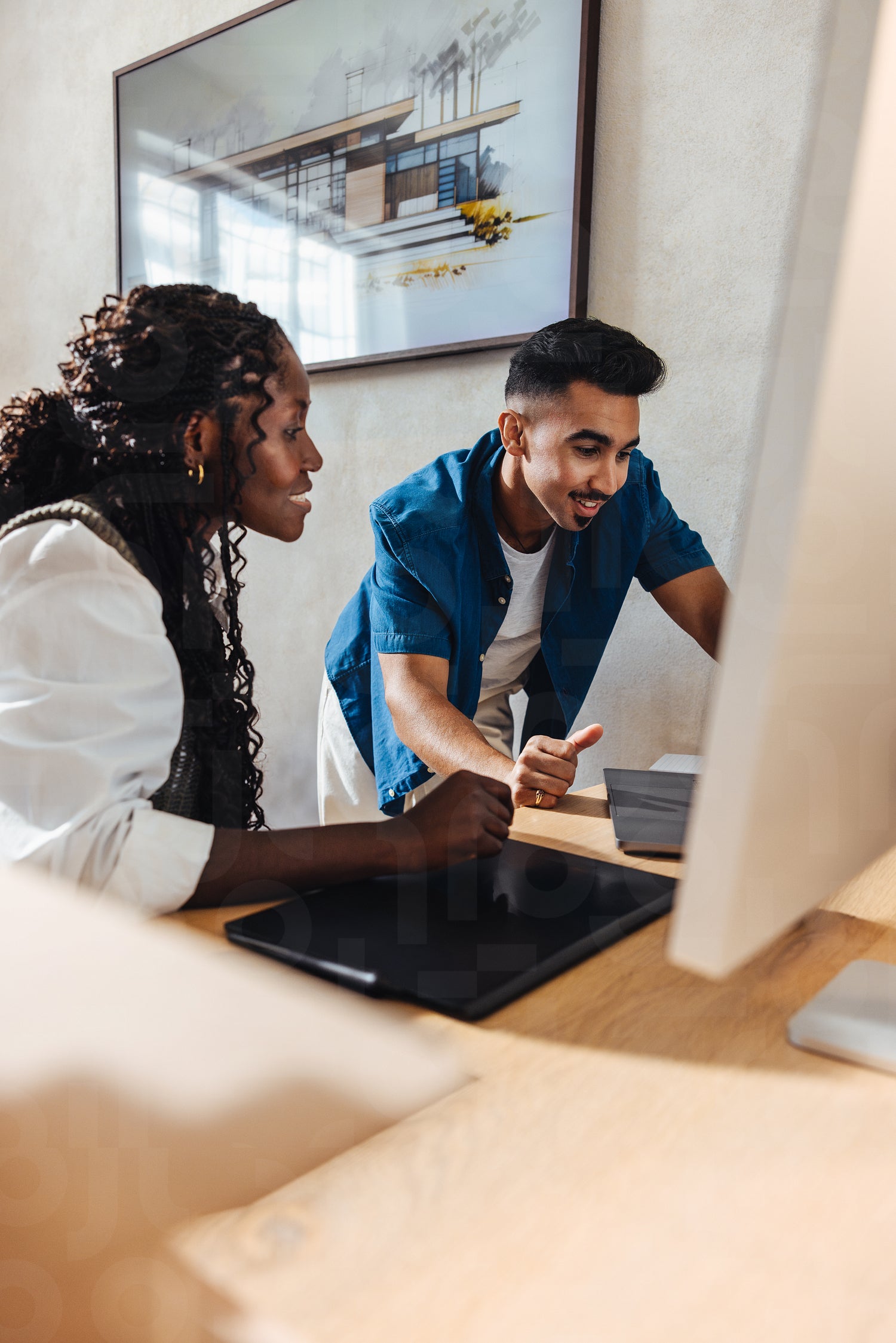 A young man and woman are working together at a desk in an architecture studio, showcasing a collaborative work environment with a creative focus.