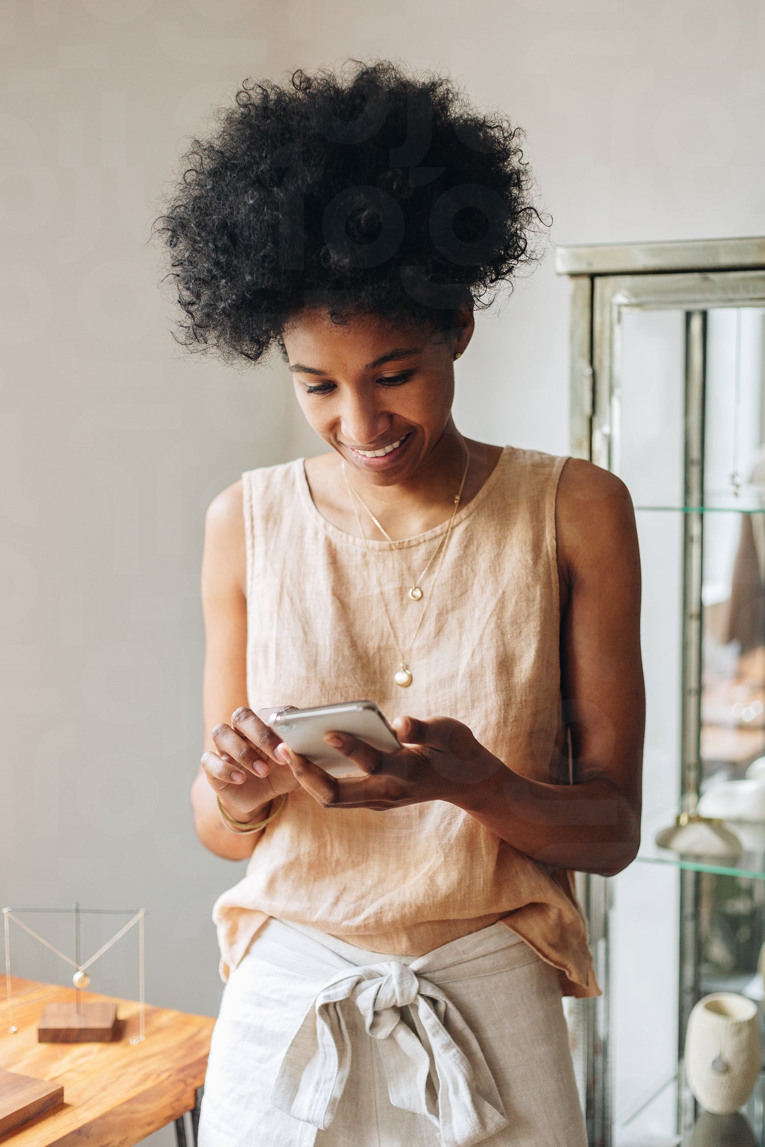 Owner in studio using phone for online selling of designer ornaments. Young jewelry designer checking for new orders of handmade ornaments on phone in studio.
