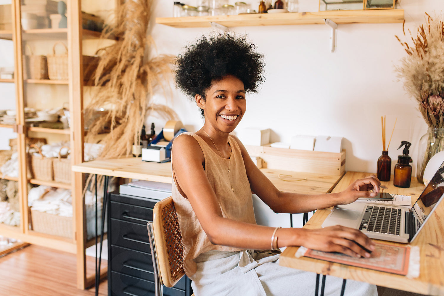 Young woman entrepreneur sitting at desk with laptop in workshop. Young artisian using laptop in jewelry designing studio.
