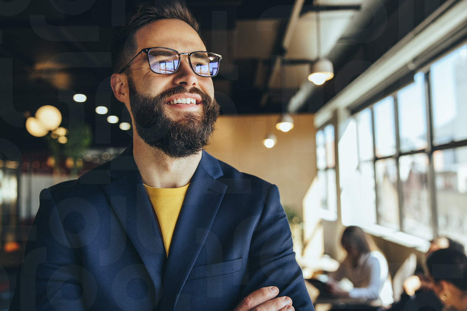 Businessman thinking of new business ideas in a co-working space. Thoughtful businessman smiling cheerfully while standing with his arms crossed. Young entrepreneur working in a modern workspace.