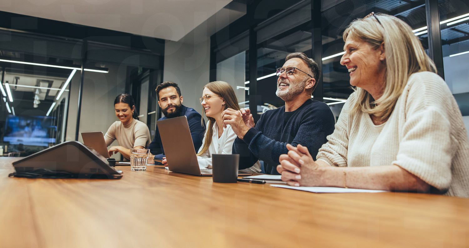 Cheerful business professionals laughing during a briefing. Group of happy businesspeople enjoying working together in a modern workplace. Team of diverse colleagues having a meeting in a boardroom.