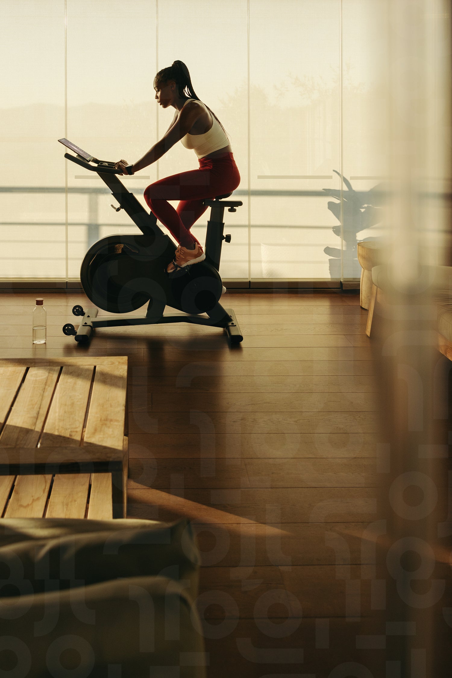 Woman demonstrates how a smart bike is transforming home fitness. Female athlete working out at home with ease, achieving her health and fitness goals without having to leave the house.