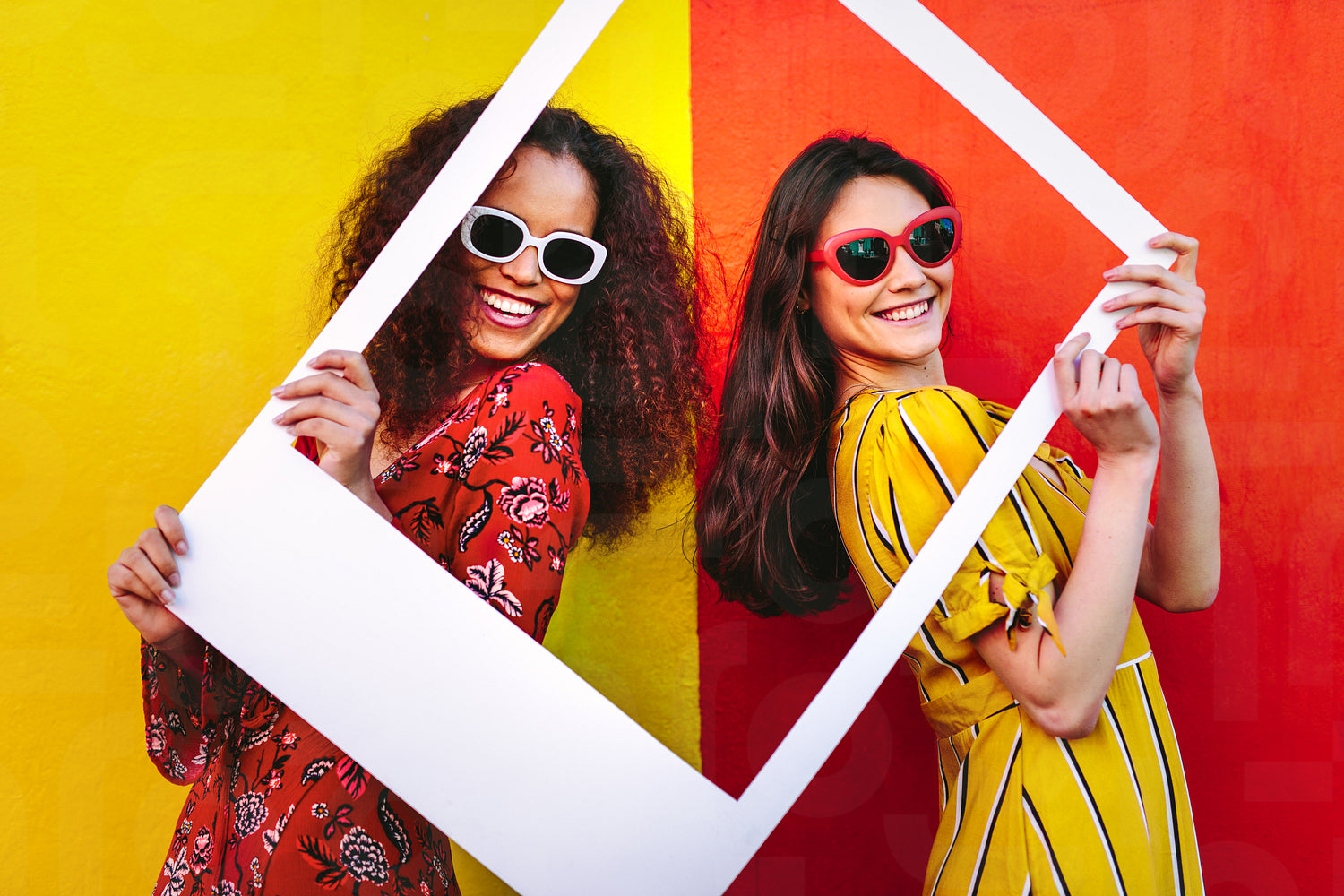 Portrait of beautiful women holding a blank photo frame in hand and smiling. Girls wearing sunglasses standing against red and yellow colored wall.