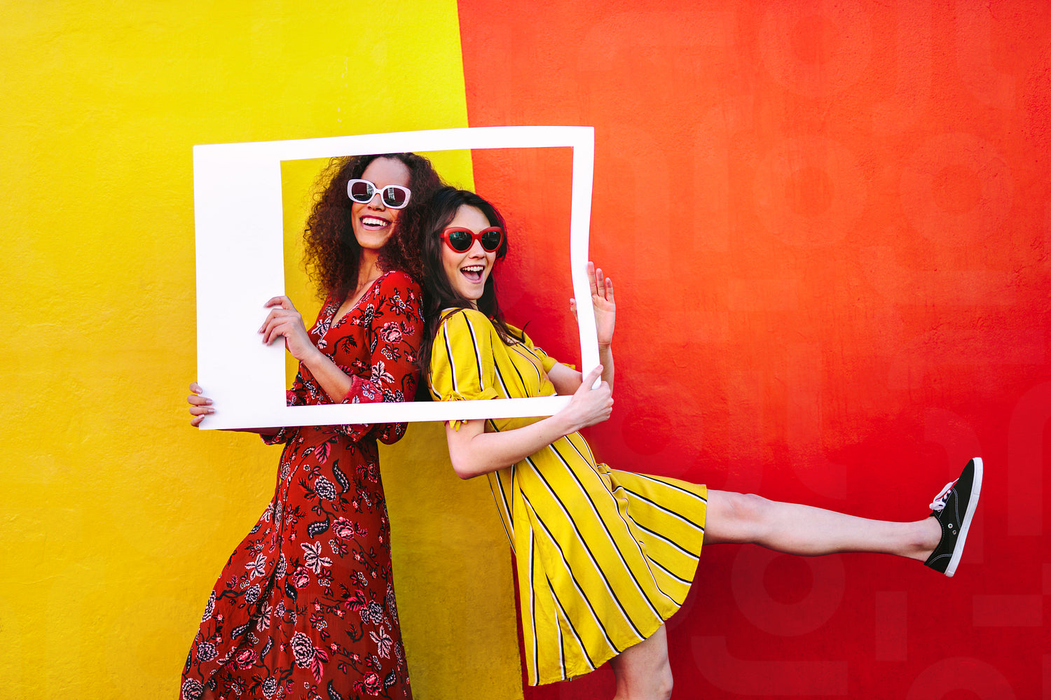 Excited girl friends with empty photo frame standing against colored wall. Women travelers wearing colorful dresses and sunglasses posing with empty picture frame.