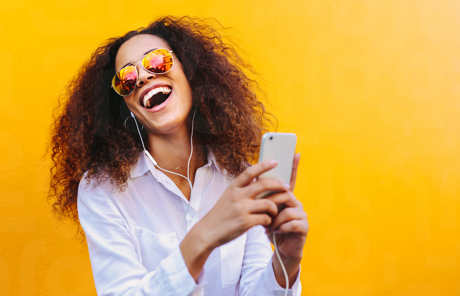 Laughing young woman listening to music on earphones using a cell phone. African girl with curly hair wearing sunglasses against yellow wall listening to songs on smart phone.