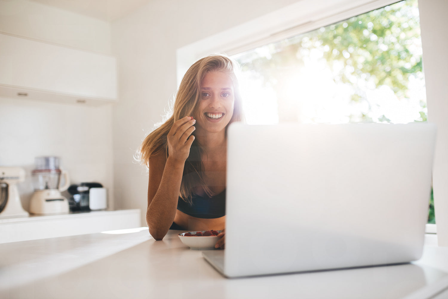 Beautiful girl eating berries and smiling while leaning on the table in the kitchen with laptop.