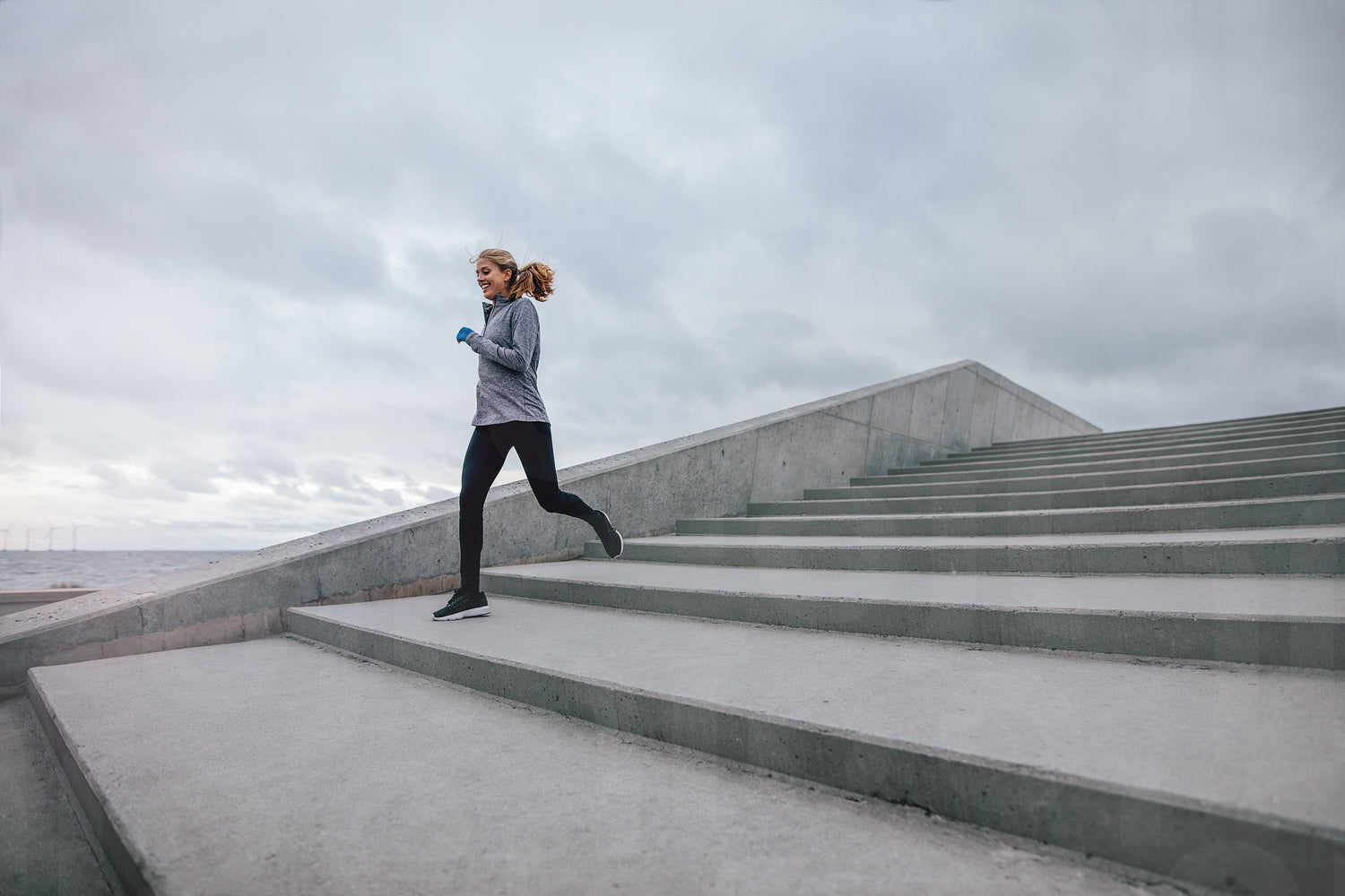Outdoors shot of fitness woman running down on steps. Runner exercising on stairs in morning.