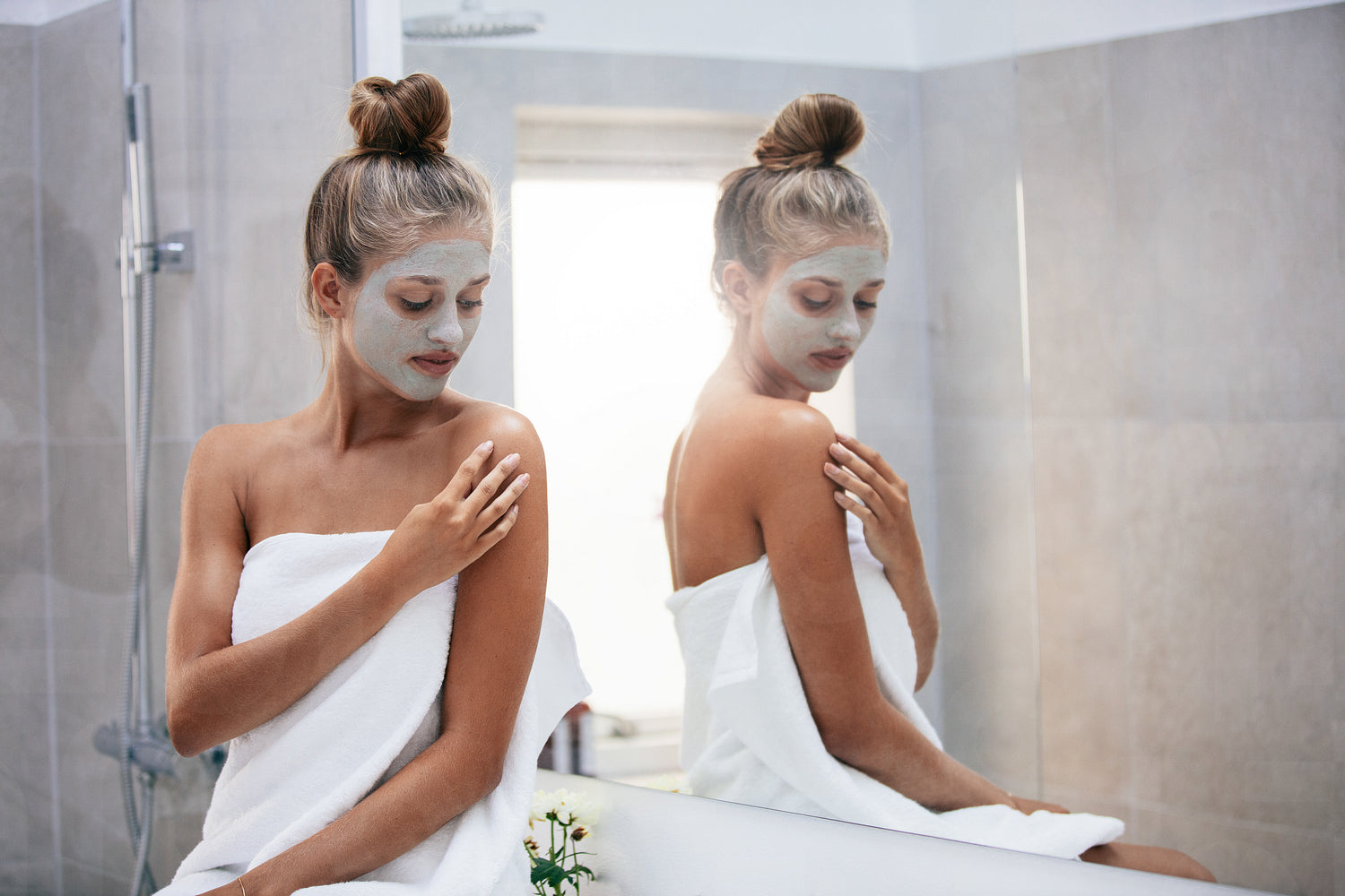 Beautiful young woman sitting in bathroom by the mirror with face mask. Female doing skin treatment after bath