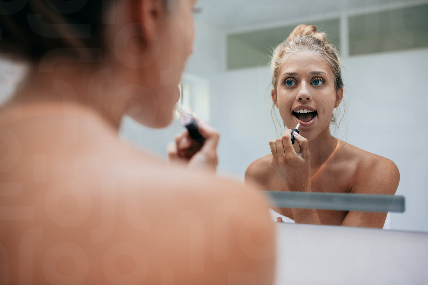 Reflection of woman in the mirror while applying makeup on her face. Caucasian female putting on lipstick in bathroom.