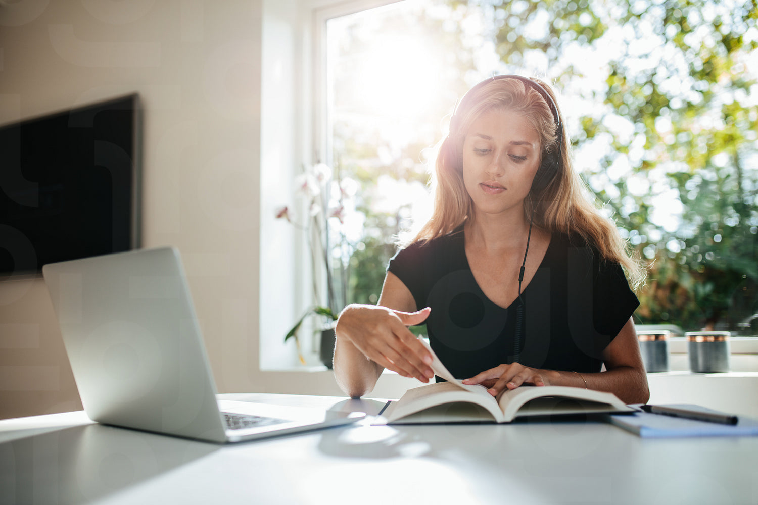 Young woman studying at home. Young woman sitting at table with laptop reading book.