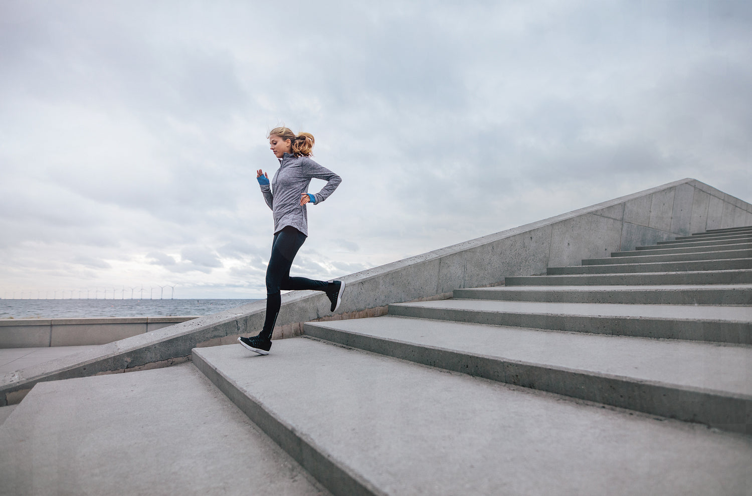 Full length of healthy sports woman running down the stairs. Fitness female workout outdoors.