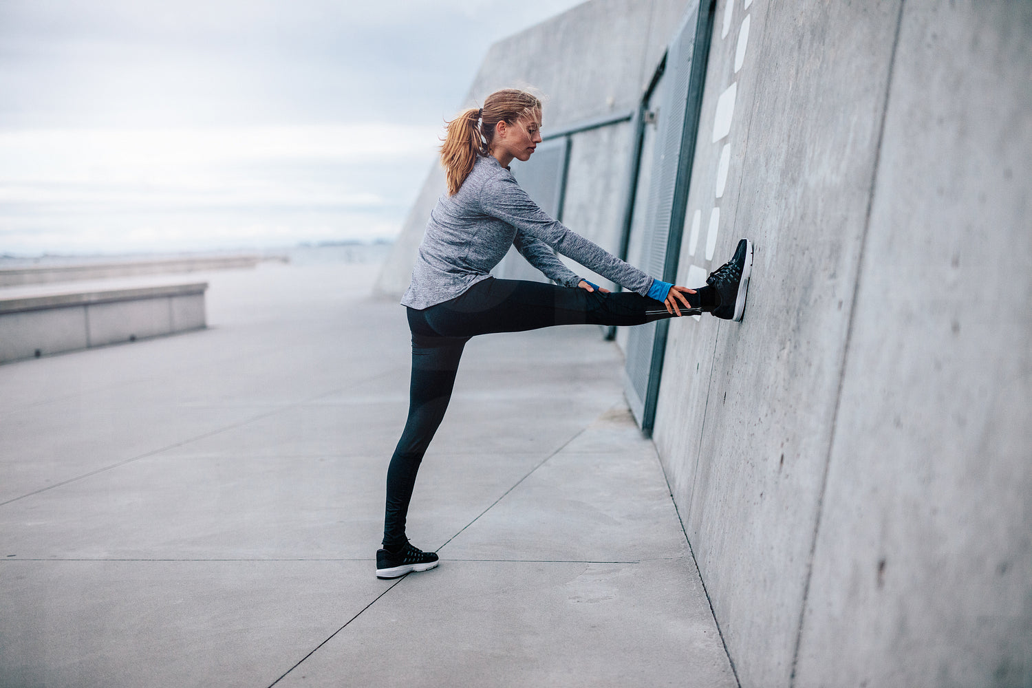 Side view shot of young fitness woman stretching outdoors. Female stretching legs against wall.