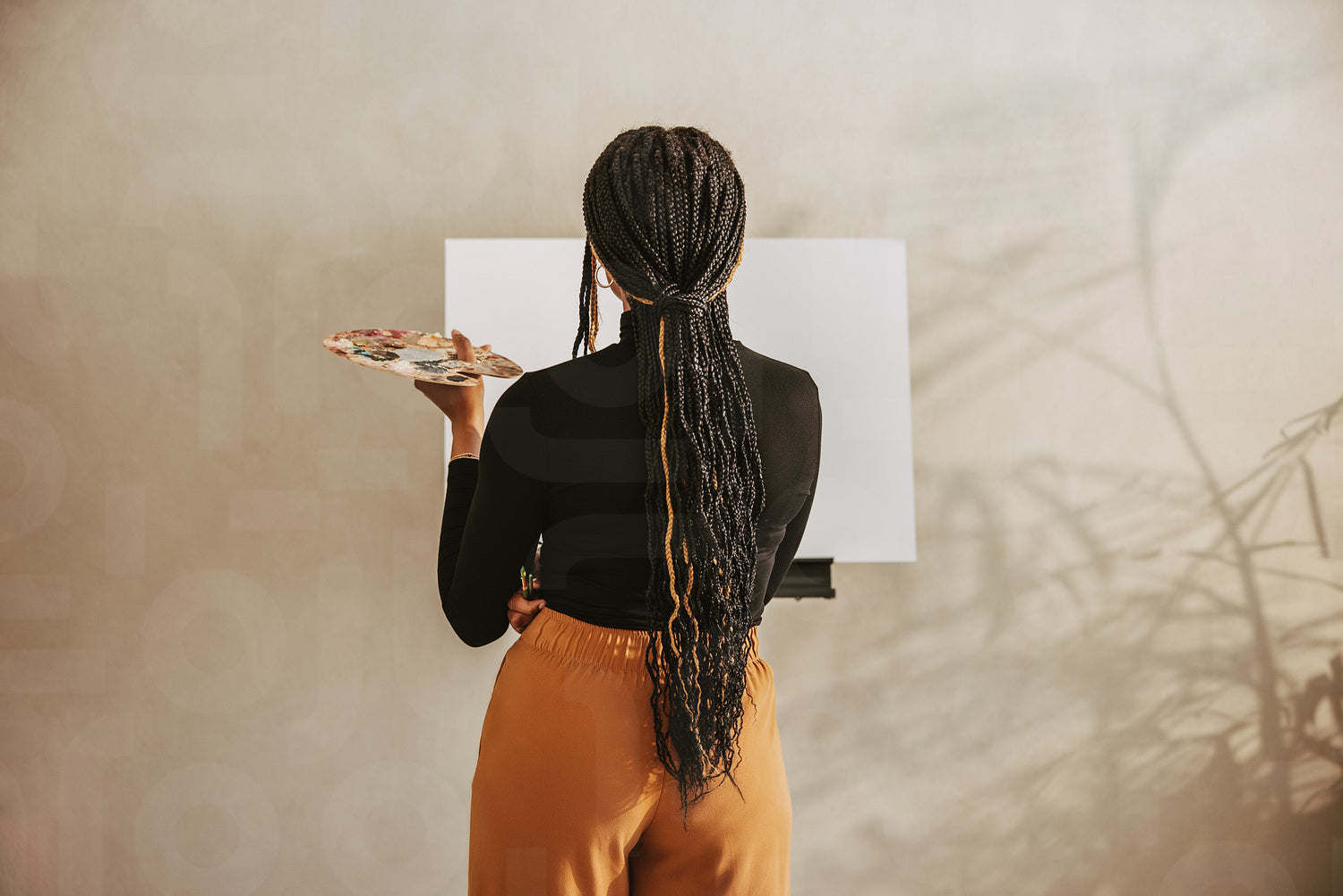 Creative young woman holding a palette while standing in front of a canvas. Rearview of a female painter contemplating new ideas in an art studio. Artistic freelancer working in a new project.