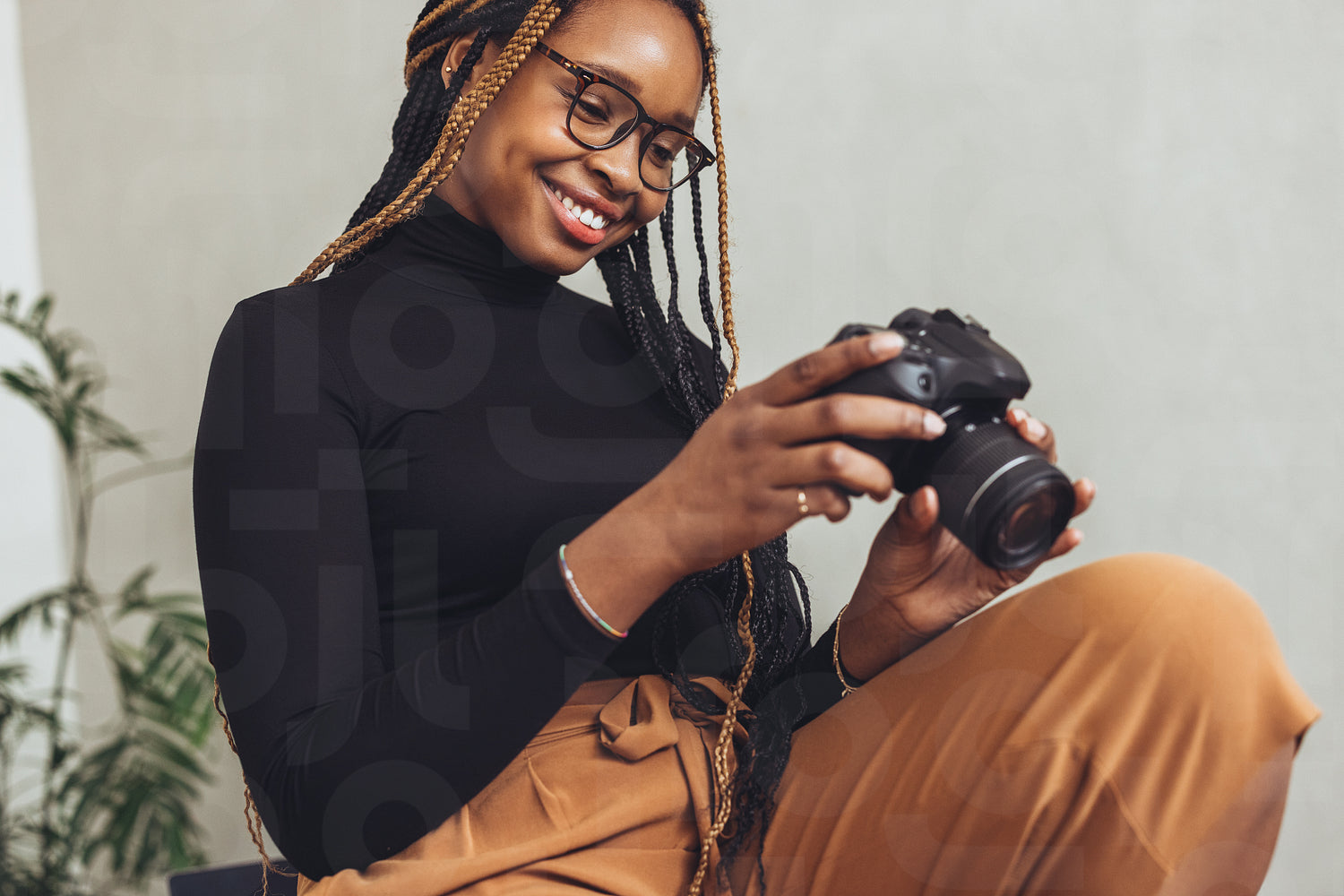 Doing some camera work. Happy female photographer smiling cheerfully while holding a dslr a camera in her home office. Artistic young freelancer working on a new creative project.
