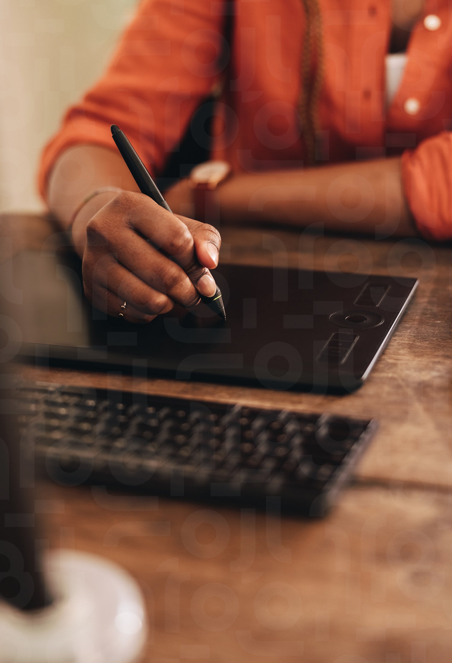 Female freelancer drawing on a drawing pad. Unrecognizable young woman sitting in front of a computer at her desk. Creative graphic designer working on a new project in her home office.