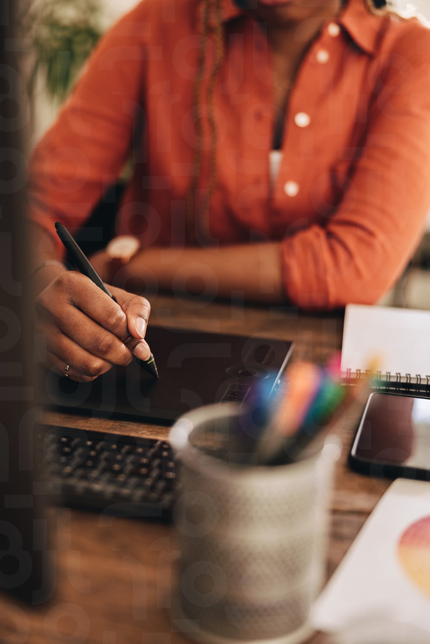 Graphic designer drawing on a digital tablet. Unrecognizable young woman sitting in front of a computer at her desk. Creative female freelancer working on a new project in her home office.