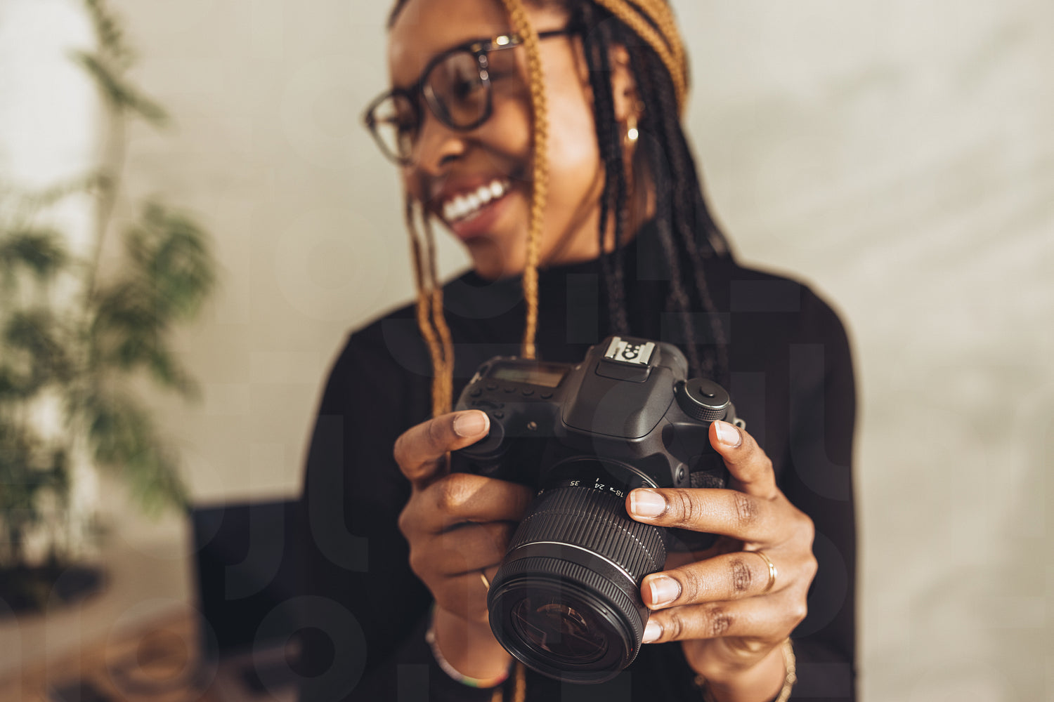 Woman holding a dslr camera in her workspace