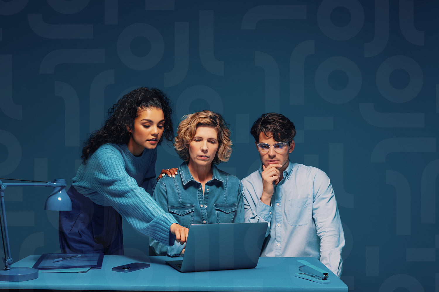 Colleagues brainstorming and strategizing with a manager in a monochromatic blue office, collaborating with a laptop.