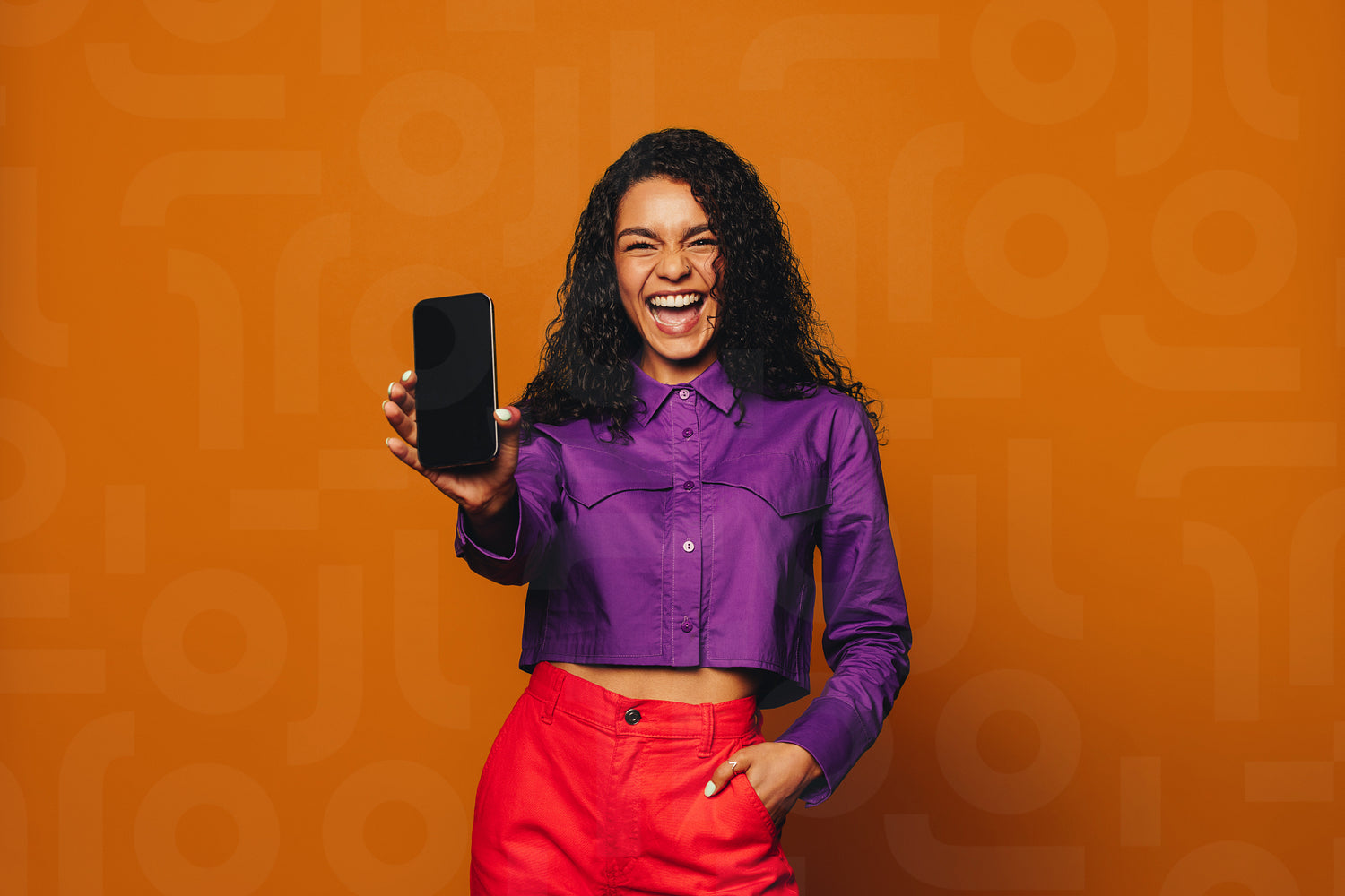 Woman in casual clothing stands against a vibrant orange background. She holds a mobile phone, recommending and showing something on the touchscreen. Her cheerful smile and laughter convey a modern lifestyle and vibrant colours.