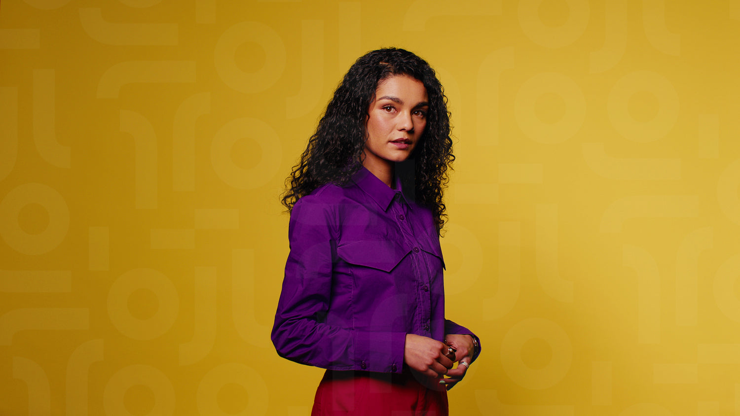 Confident woman in purple shirt and red pants poses against a vibrant yellow backdrop