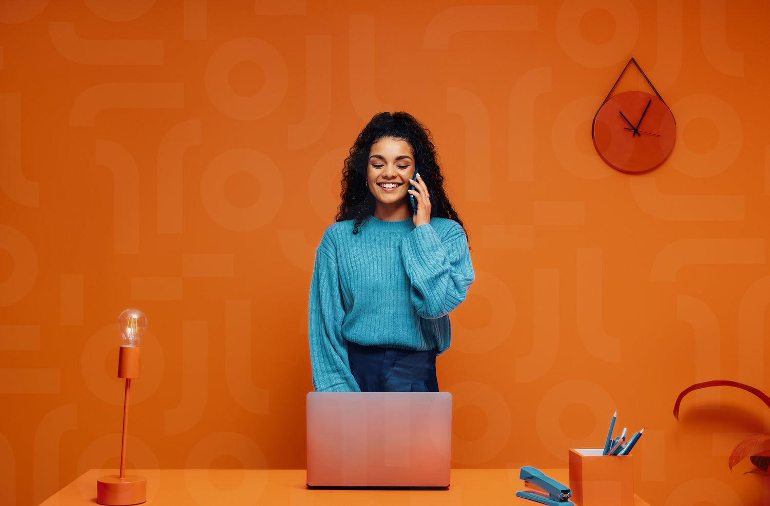 Female entrepreneur standing and talking on her phone in her home office with a laptop, surrounded by monochromatic decor in an orange themed office
