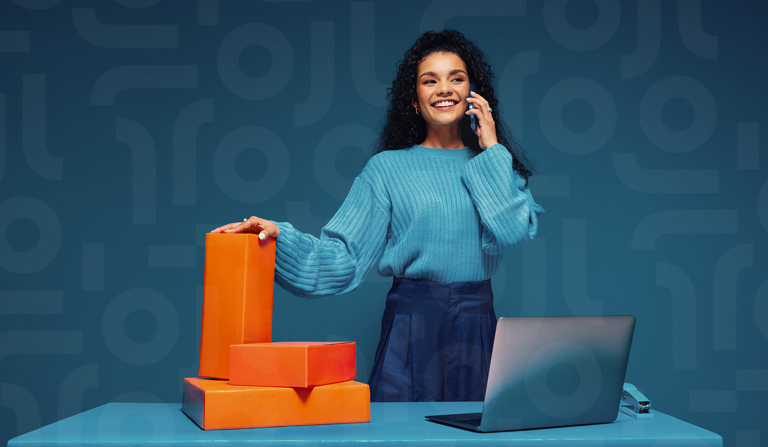 Smiling woman agent negotiating sales deals while standing next to packages, showcasing vibrant orange color blocking elements.