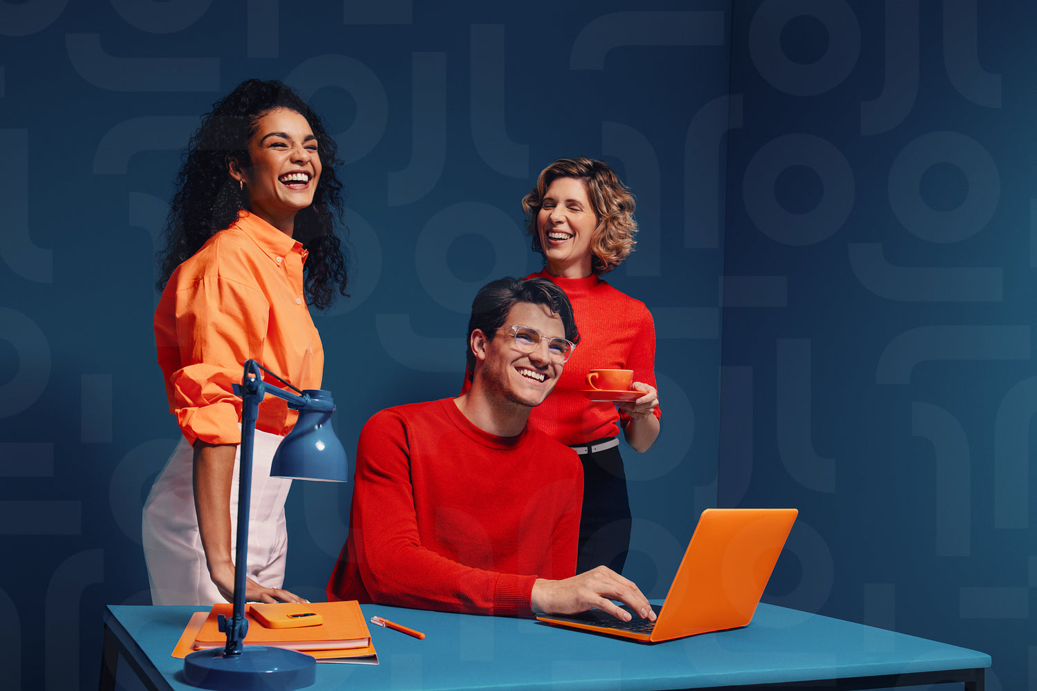 Cheerful and diverse team in a bold colorful office office environment, celebrating their achievement with smiles and positive vibes.