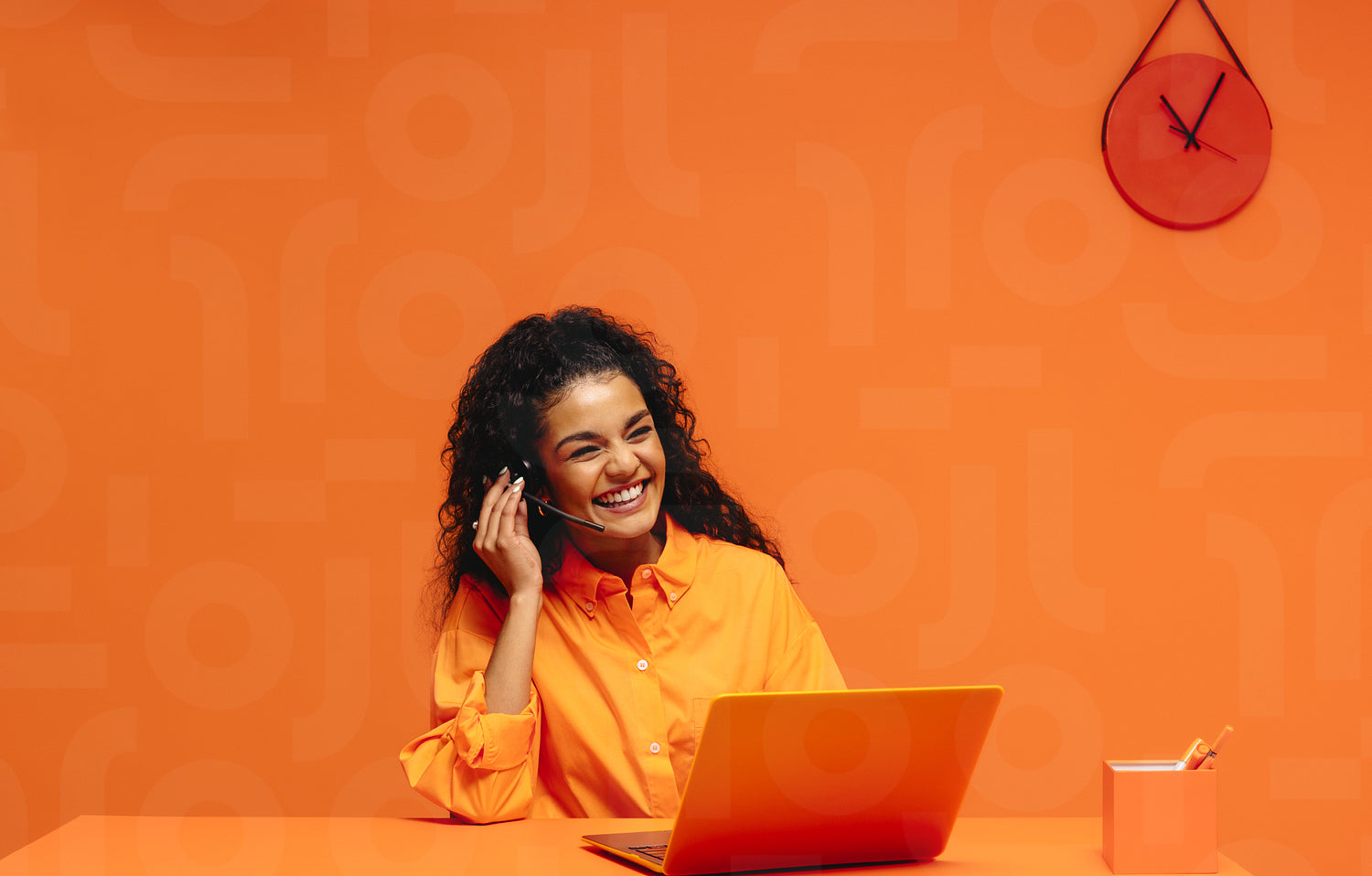 Happy female call center employee laughing in a vibrant orange monochromatic workspace