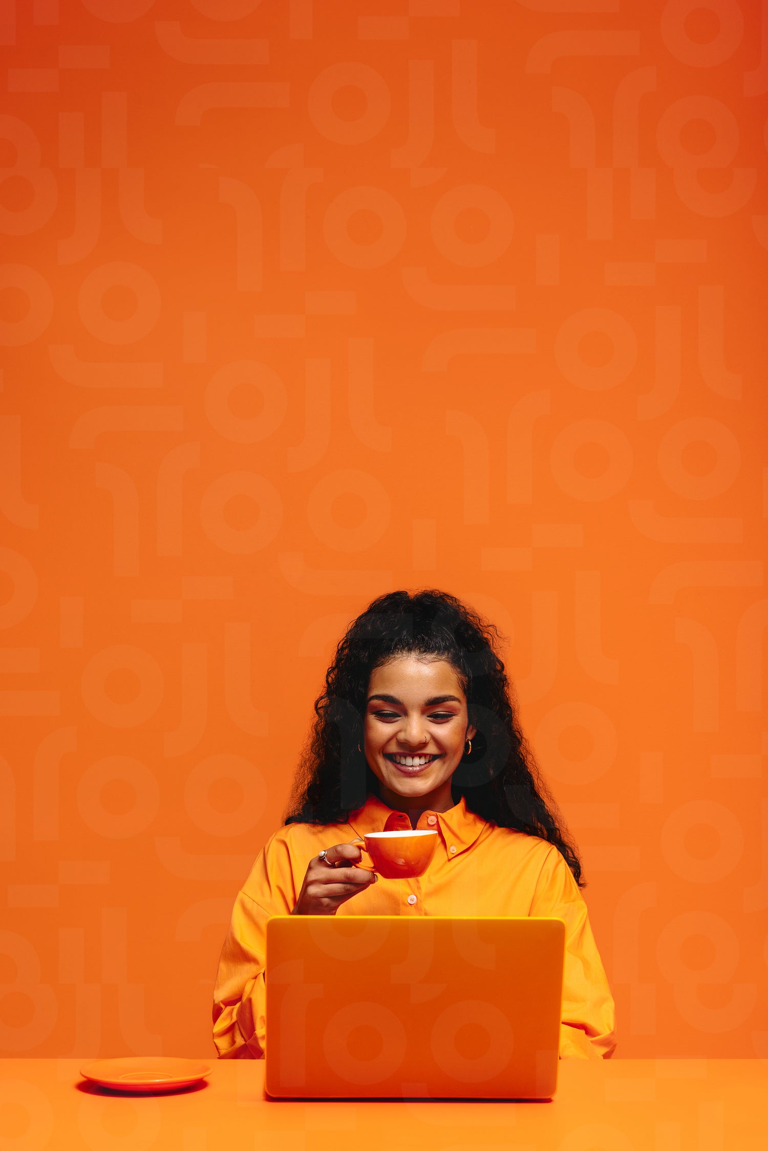 Happy woman smiling while browsing on her laptop, enjoying coffee in a vibrant, monochromatic orange workspace emphasizing creativity