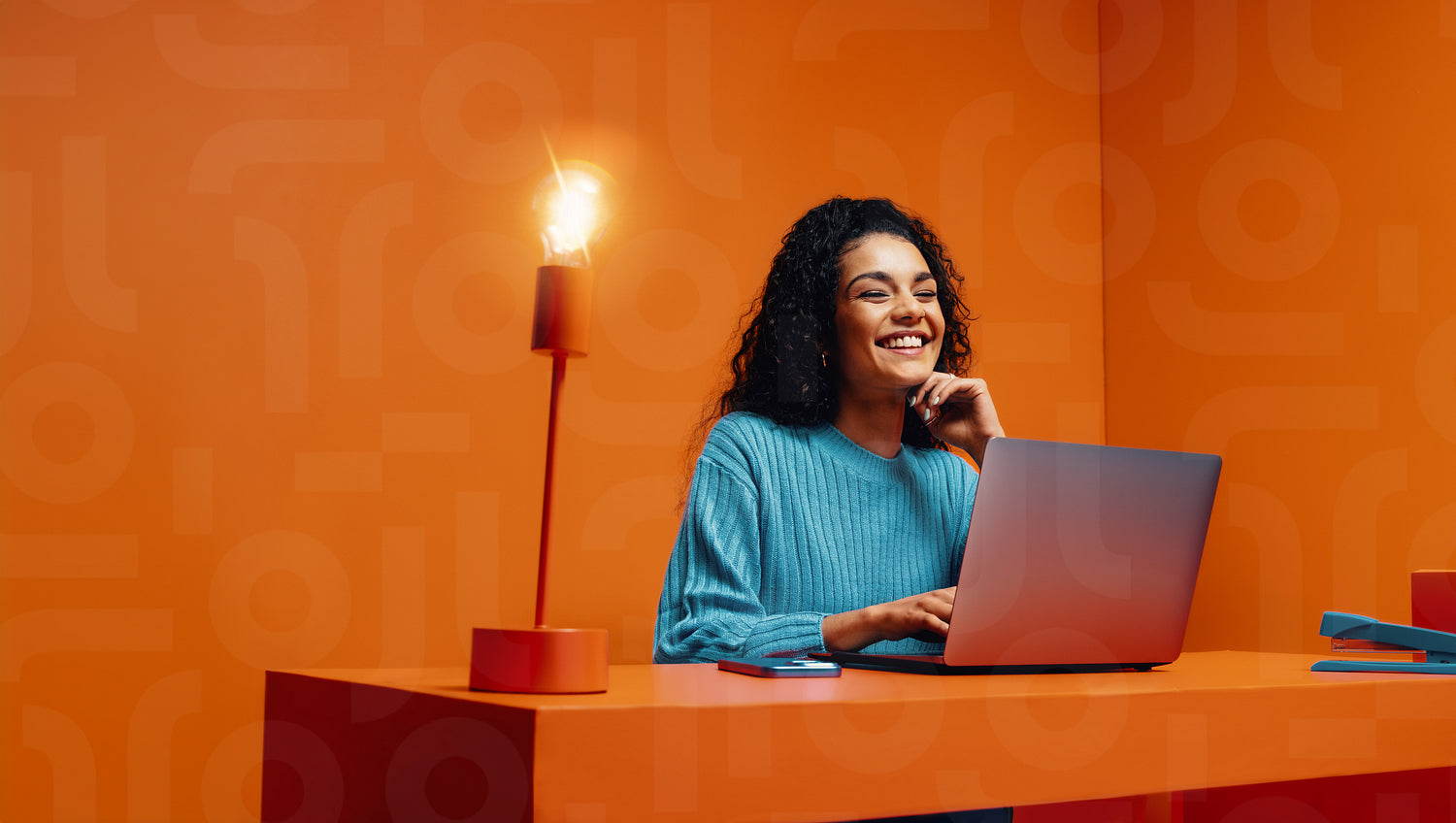 Happy woman sitting at desk with light bulb , thinking of creative ideas.