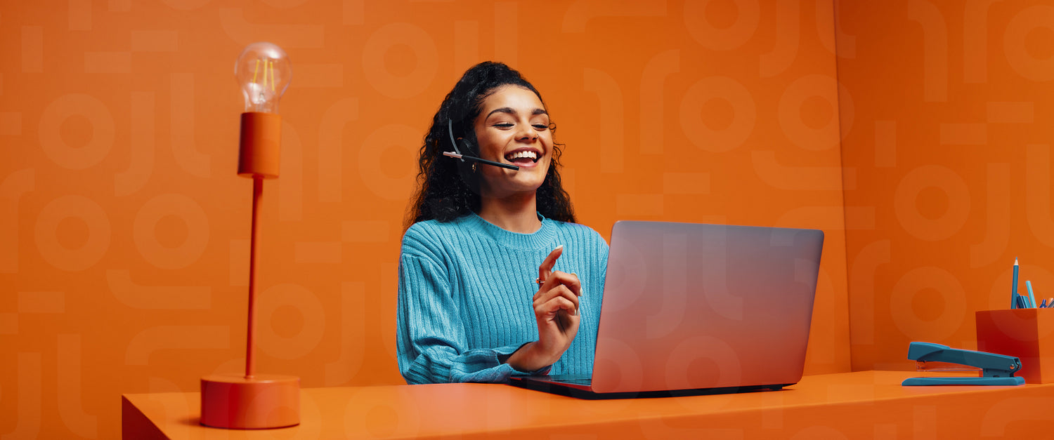 Happy woman using laptop for brainstorming and customer service. Smiling agent in e-commerce wearing headset, working wirelessly.
