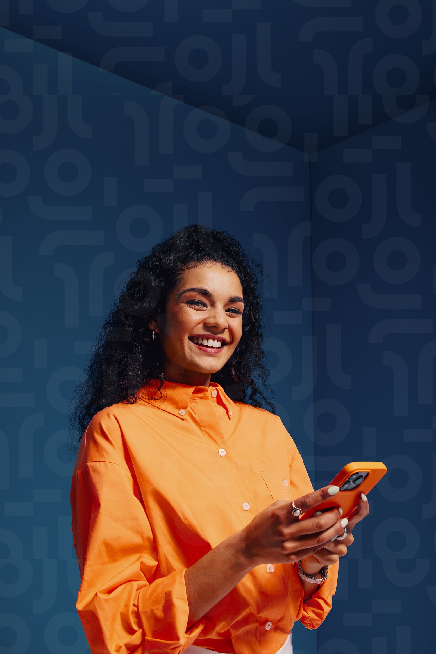 Happy woman using a smartphone in a vibrant, colorblocked monochromatic environment, ideal for creative, innovative settings.