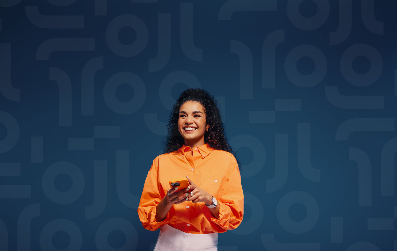 Happy young woman texting in a vibrant colorblocking orange and blue outfit, exuding positivity and ambition.