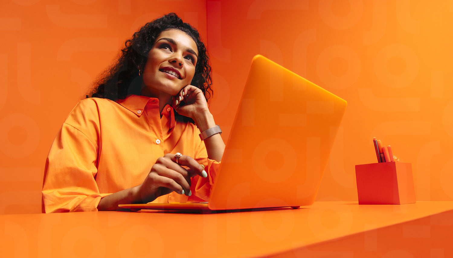 Pensive woman working on a laptop in a vibrant, monochromatic orange office space