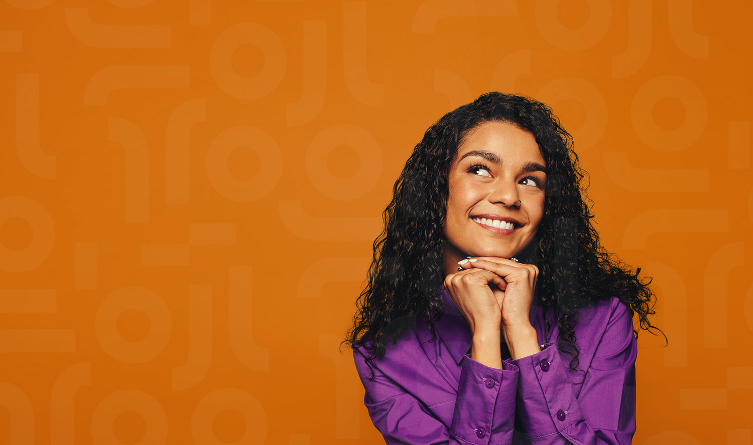 On a orange background, a cheerful woman with curly hair and a vibrant smile gazes thoughtfully. Her colorful attire adds to her youthful and casual vibe.
