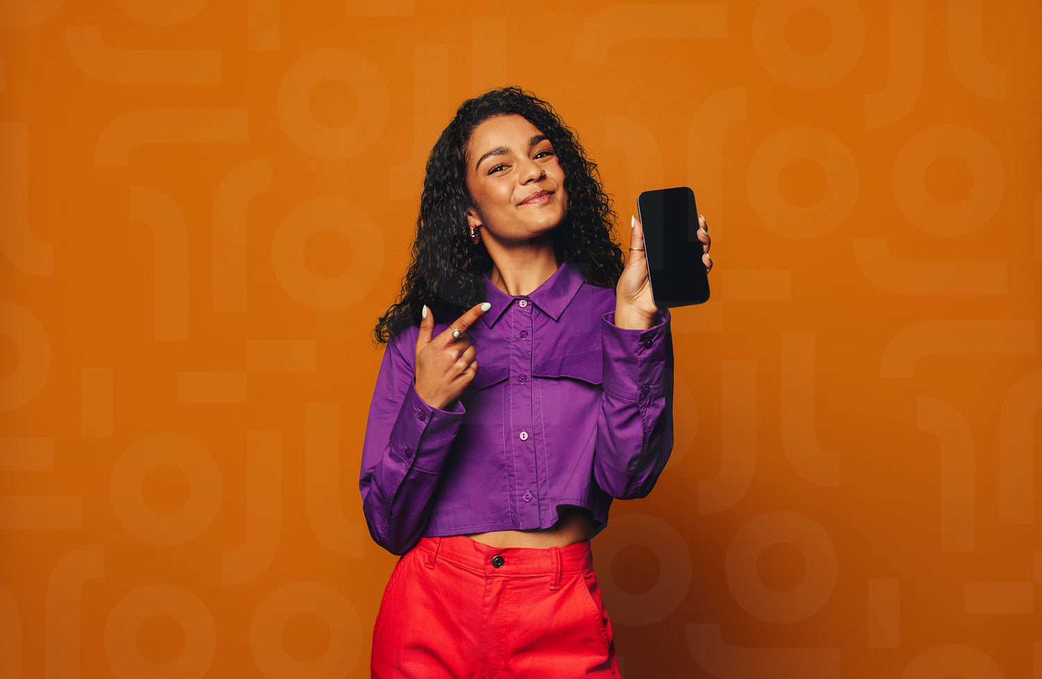 Young woman in casual clothing stands in front of a orange background. She holds a smartphone with a touchscreen in one hand and shows something off-camera. Her curly hair frames her modern look while wearing colorful color-blocking.
